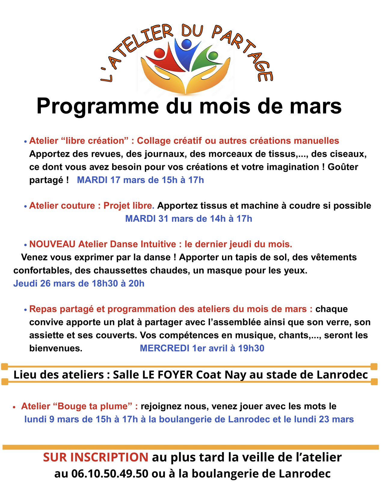 Programme de "L'Atelier du Partage" du mois de mars
